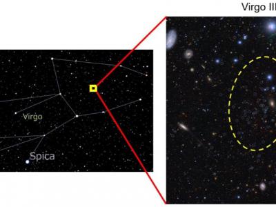 室女座中新发现的矮星系(室女座III)的位置(左)及其成员恒星(右;白色圆圈)。...