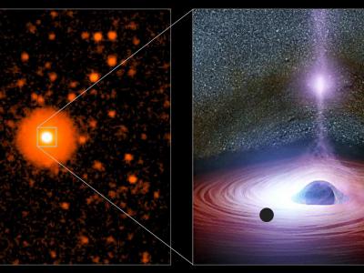 左图:OJ 287及其环境的快速紫外图像,结合了560张单次曝光。右图:艺术家对OJ 287中...