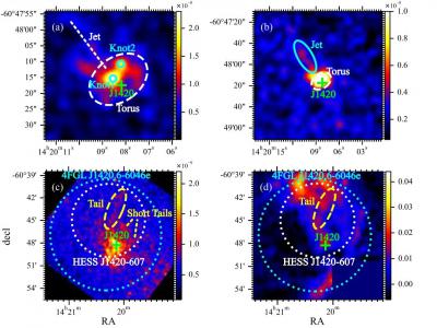K3 PWN在不同空间尺度上的2–7 keV Chandra图像(a–c)和SUMSS 843 MHz图像(d)。...