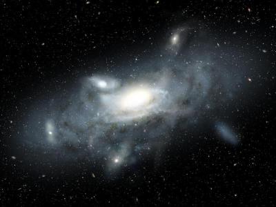 这张照片展示了艺术家对银河系年轻时的印象。五个不同类型和大小的小卫星星系正在被...