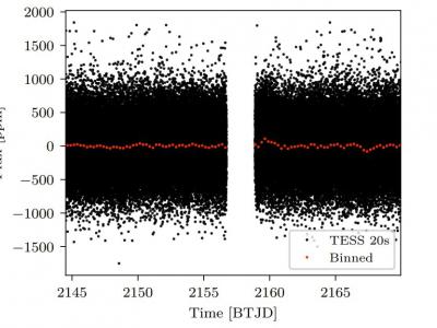TESS扇区31 HD 19467的光曲线。黑点显示原始的20秒节奏数据,红点显示以6小时为时间...