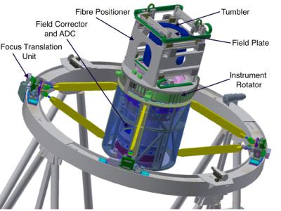 WEAVE顶端组件的计算机辅助图解(CAD)表示,包括主聚焦(场)校正器系统、仪器旋转...