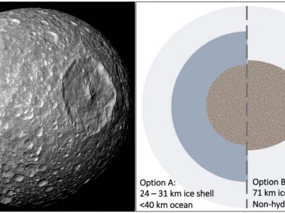 研究人员在土卫一上模拟了赫歇尔撞击盆地,这表明土星卫星可能有一个薄薄的冰壳围绕...