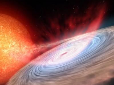 一位艺术家关于双星对的概念,其中一颗较小的恒星向中子星输送物质。中子星中的扰动...