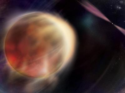 在这张图中,一颗绕轨道运行的恒星开始遮蔽它的伙伴,这是一颗快速旋转的超高密度恒...