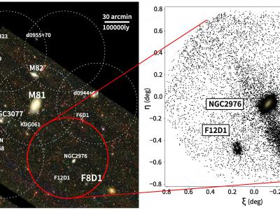 (左)M81集团测量足迹(白色和红色圆圈)覆盖在斯隆数字巡天图像上。(右)与F8D1...