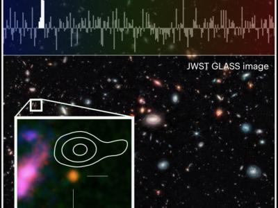 星系GHZ2 / GLASS-z12的图像与相关的ALMA光谱。ALMA的深度光谱观测揭示了与星系附近...