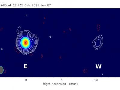 J2102+6015的自然加权22GHz EVN图像。较亮的东部和较暗的西部特征分别标记为E和W。...