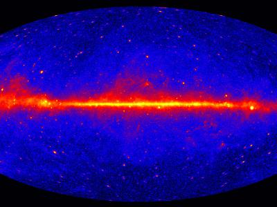 费米LAT图像显示了来自银河系中心平面(地图中心)和活动星系的明亮、漫射的辉光作...
