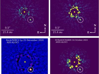 使用斯巴鲁望远镜和凯克天文台拍摄的褐矮星HIP 21152 B的四张直接图像。主星在图像...