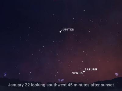 1月22日傍晚天空的插图,描绘了金星和土星的合相。(图片来源:NASA/JPL-Caltech)...