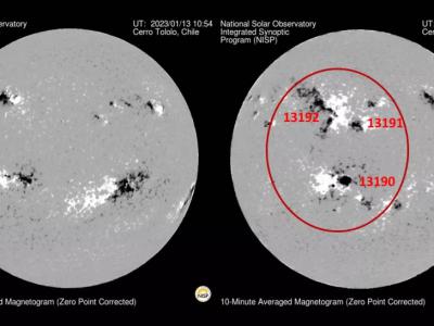 2023年1月13日(左)和2023年1月18日(右)看到的太阳活跃区域。 (图片来源:NSF/...
