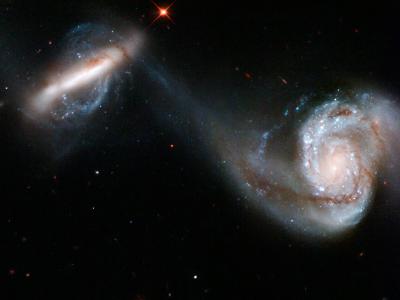 从哈勃太空望远镜看到的两个相互作用的星系。图片来源:NASA/ESA/哈勃遗产团队(神...