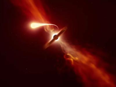 艺术家对恒星(前景)在接近超大质量黑洞时被打乱的印象。 (图片来源:ESO/M. Kor...