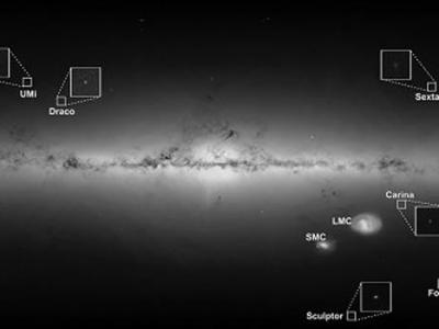 盖亚EDR3银河系全景图,方块标记出麦哲伦云星系以及部分矮星系(神秘的地球uux.cn报...