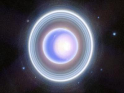 在这张詹姆斯·韦伯太空望远镜的照片中,天王星在其明亮的光环外壳内发光。(图片来...