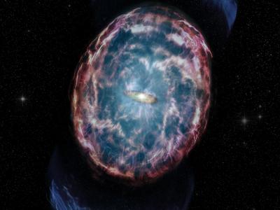 这位艺术家的概念展示了一个假设的事件,称为超千新星。一颗大质量恒星在超新星爆炸...