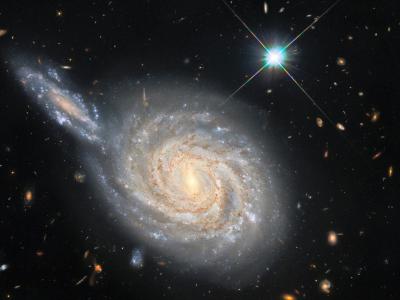哈勃太空望远镜捕捉到的双鱼座螺旋星系NGC 105 似正在与邻近星系发生碰撞但实际不是...