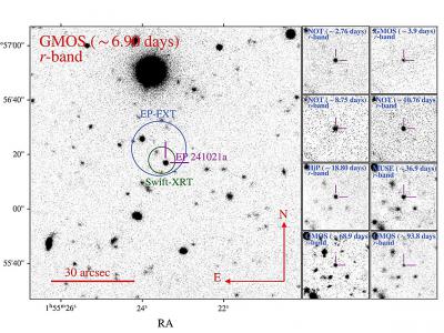 X射线瞬态EP 241021a的r波段图像;事件位置用品红色线条标记。大面板基于EP 241021a...