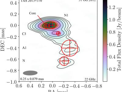资料图:TXS 2013+370的22 GHz模型拟合和总强度空间-VLBI图像,来自地面和空间-VLB...