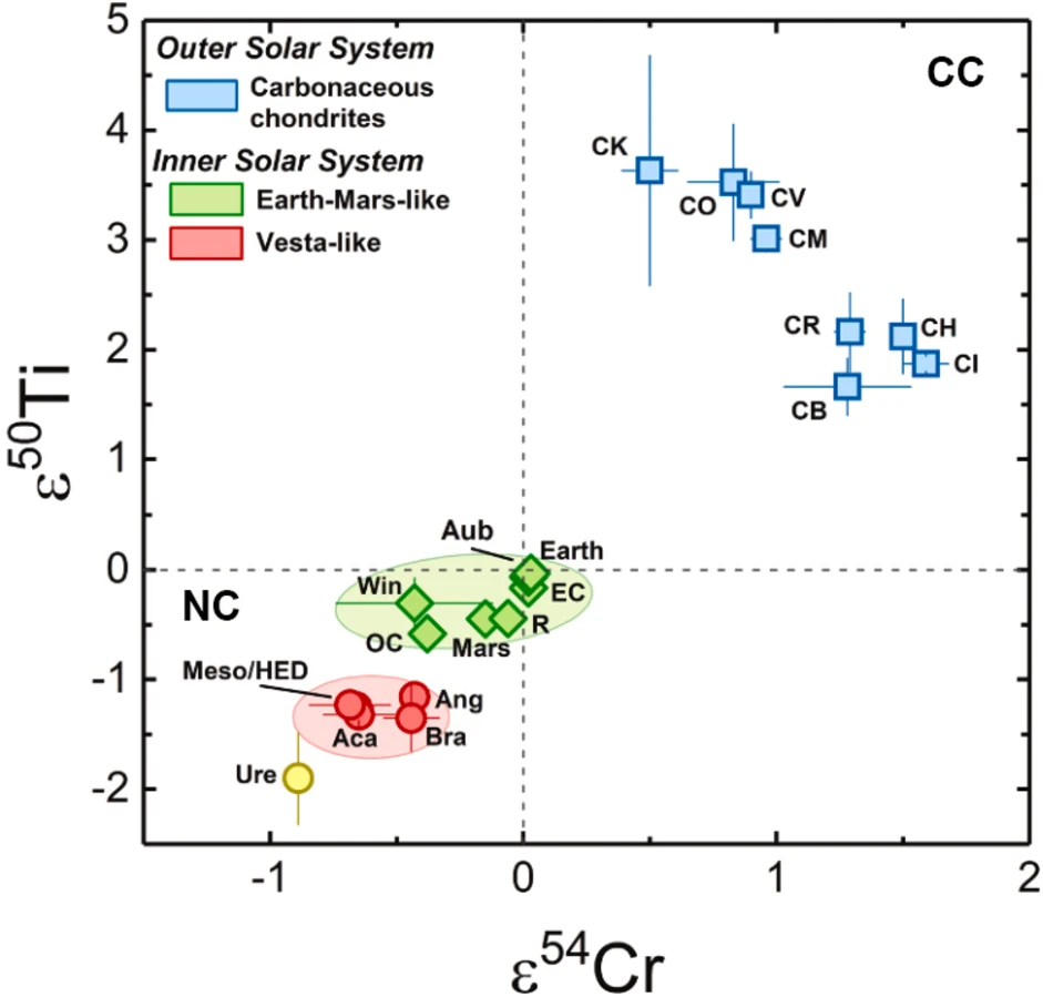 不同陨石群的\(\varepsilon ^{50}\)Ti与\(\varepsilon ^{54}\)Cr的平均值。除了...