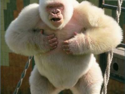 “雪花”大猩猩先天性白化症,这种基因突变导致它的皮肤和毛发色素损失,2003年它...
