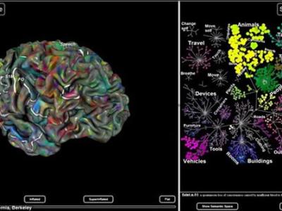 美国加州大学伯克利分鹇研究小组扫描患者大脑,绘制出大脑处理不同信息分类(图中...
