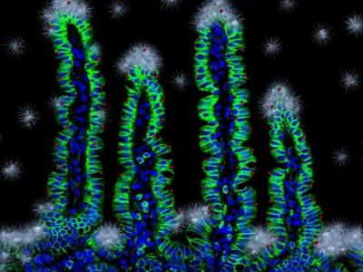 显微镜下人体肠壁上的细胞犹如挂着雪花的