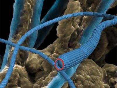 这些是海底淤泥中的导电细菌 这是四个导线状细菌的切片图。每一个细菌的表层细...