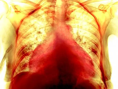 这张彩色胸腔X光影像显示一名74岁女性COVID-19病患的肥大心脏。有些病患从COVID-19...