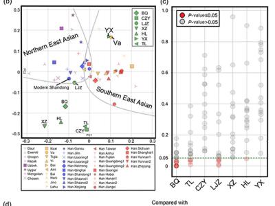 图1.古代山东人群线粒体基因组分析。(a)来自山东省12个考古遗址的古代人类的地理...