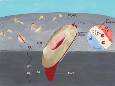 图中展示白瓜贝将足伸入沉积物以获取硫化氢。由于血液中含有血红蛋白用作输送气体,...