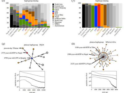 青藏高原古代和现今生活的人群之间的遗传关系分析。(a). 青藏高原古样本遗址分布 (...