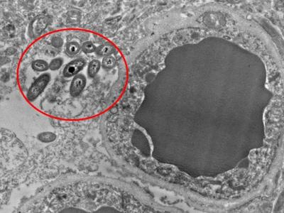 研究人员在大脑组织切片的血管旁,发现肠道细菌(红圈)。(神...