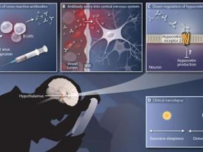 本图显示因流感病毒核蛋白而触发的抗体如何与调控睡眠(下视丘分泌素受体2)的脑...