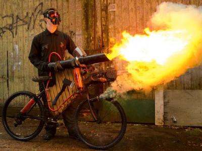 防丧尸单车配备喷火器 催泪汽体不知是否对丧尸有效 电锯确是打丧尸必备 ...