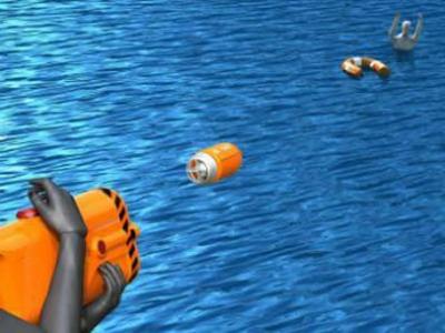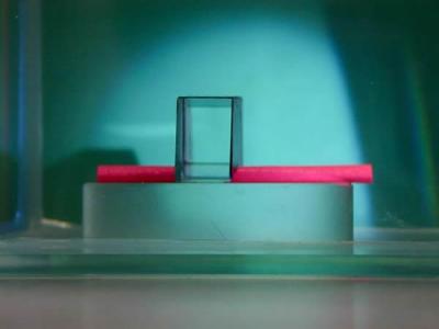 粉红色物体似乎消失在被置于水下并受到绿光照射的大块方解石后面 (神秘的地球w...