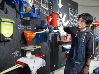 铃木友里演示水壶中的沸水如何流过水管并与新碾碎的咖啡豆混合制成咖啡 照片中...