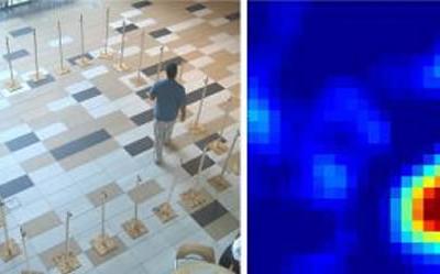 左图为一个人在方形区域中行走,方形区域由28个无线发射接收机环绕。研究者使用R...