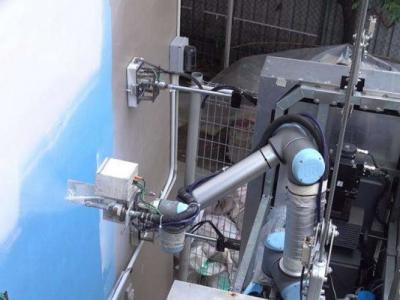 机器人用机械臂的喷射器射出油漆,翻新外墙髹漆。O...