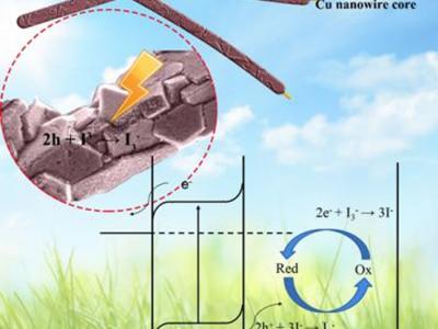铜纳米线/氧化亚铜半导体-液结太阳能电池结构及工作原理示意图,Cu2O与Cu NWs接触...