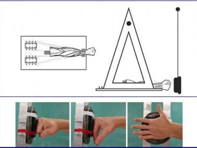 研究人员以死人臂制作仪器(上图),研究人类的手掌的结构及用途。下图为真人手臂...