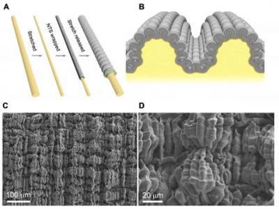 二维、分层扣住的皮芯型纤维。A)一种弹性导电纤维可通过将碳纳米管片材包裹于一...