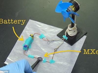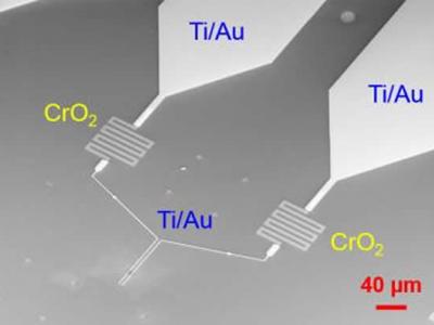 此图是用电子显微镜拍摄,显示了通过量子相位滑移纳米丝链接的两个小型氧化铬电阻...