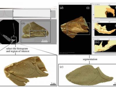 Drishti paint中使用3D Freeform Painter工具对澳大利亚早泥盆世盾皮鱼头部化石执行...
