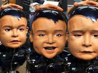 美国最新研制婴儿机器人“迭戈-圣”能够表达各种表情,图左是困惑状表情,图中是...