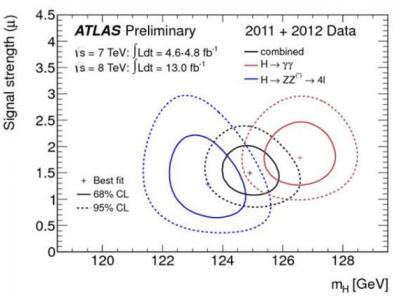 来自欧洲核子研究组织(CERN)的数据图,蓝色线显示的是123.5GeV的新玻色子信号,红...