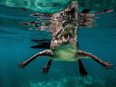 摄影师在古巴女王花园海洋公园抓拍鲨鱼却遭遇水下掠食者——咸水鳄 这条鳄鱼体...