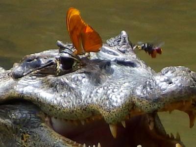 哥斯达黎加一只朱莉娅蝴蝶和蜜蜂栖息在凯门鳄脸上舔舐它的眼泪(图片:神秘的地...