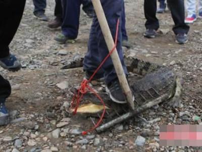 工作人员用绳子将鳄鱼的嘴绑住 鳄鱼伏在雾凇大桥附近的水中 渔政人员用耙子...
